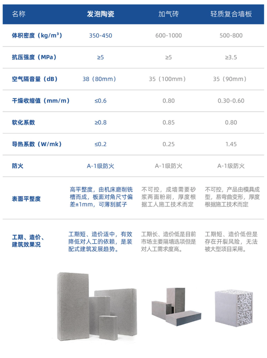 · 輕質:發泡陶瓷的容重為380~430kg/m?,只有傳統加氣磚的一半重量,可大大減少建筑結構的荷載。