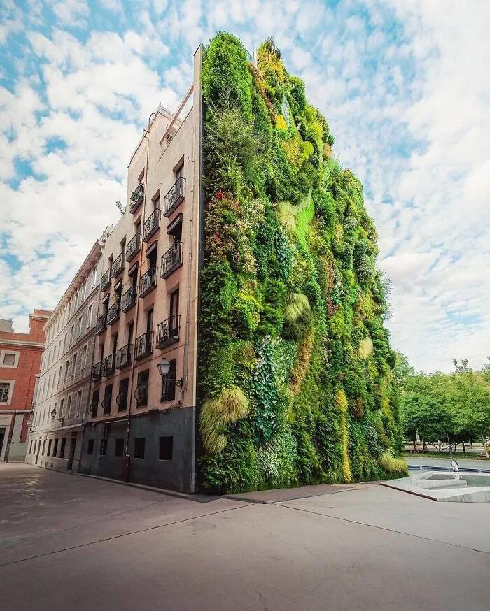 位于西班牙馬德里的垂直花園,位于馬德里當(dāng)代藝術(shù)博物館Caixa Forum之前,是目前世界上種植最好的垂直綠化景觀。它是帕特里克·布蘭克(Patrick Blanc )在2008年建造完成的。四層樓高的綠墻與相鄰建筑物的深橙色鐵銹形成鮮明的對(duì)比,植物茂盛的垂直花園吸引了游客坐在周圍休息,以躲避馬德里灼熱的太陽。
