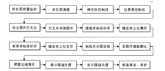 基本流程步驟:基層檢查 → 彈放基準(zhǔn)線 → 粘貼保溫裝飾復(fù)合板 → 加錨固件 → 貼分格縫 → 施密封膠 → 清潔面板。