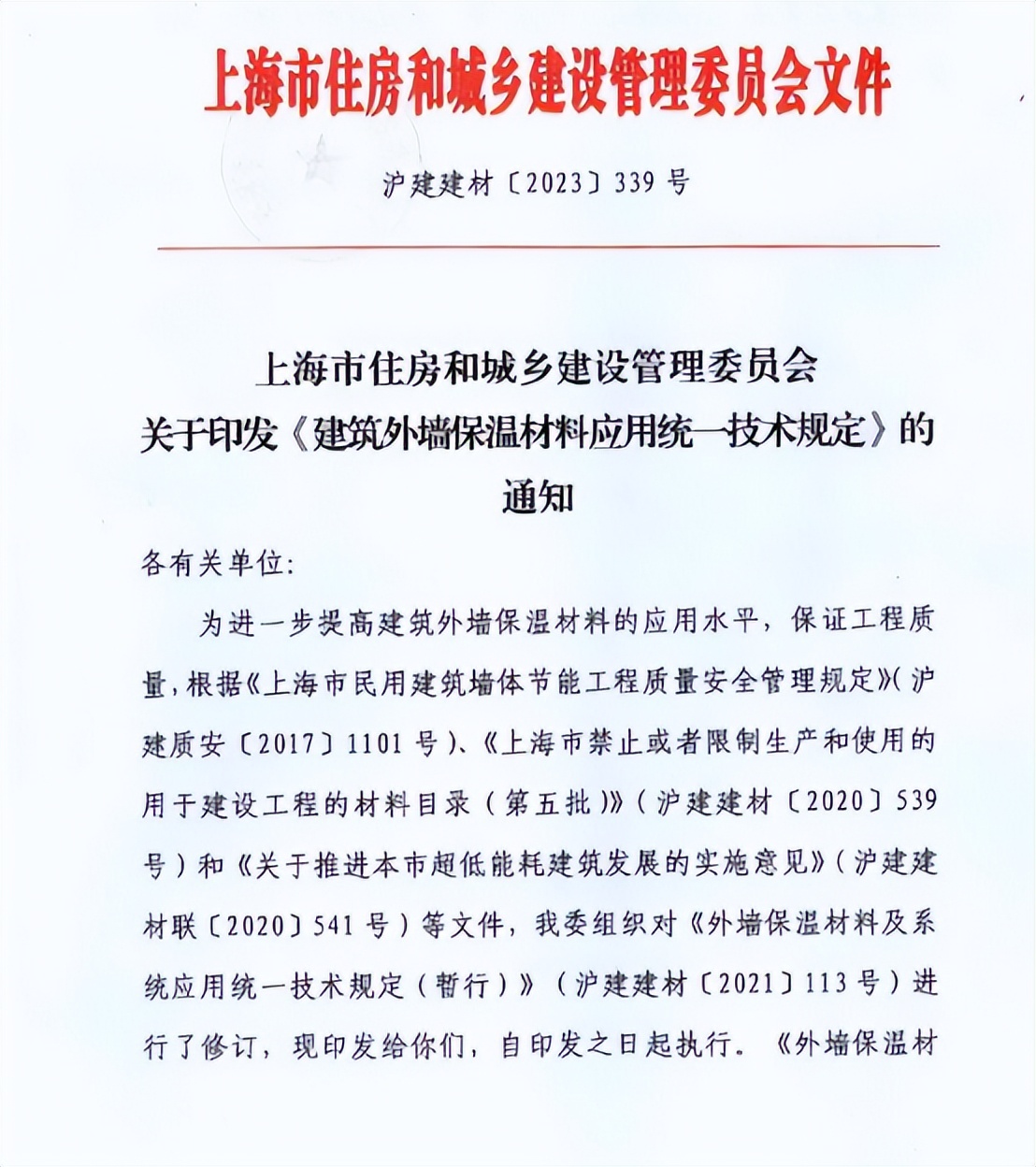 上海市發布《建筑外墻保溫材料應用統一技術規定》,對保溫裝飾板外保溫系統用保溫材料的性能要求具體規范。